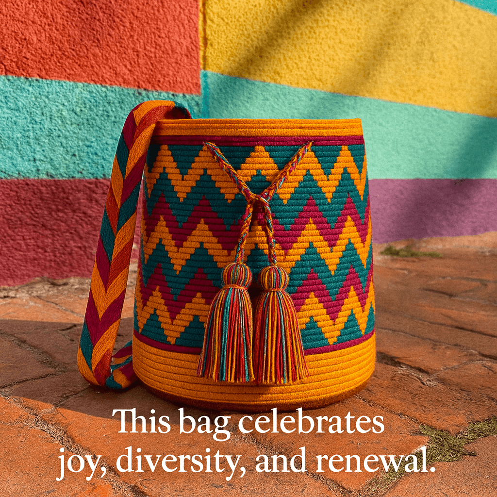Culturally, this bag pays homage to the Wayuu people’s deep connection with nature and the cycles of the sun. The symmetrical patterns represent balance between the physical and spiritual worlds, reflecting the wisdom of a culture that weaves life’s transitions into timeless art.
